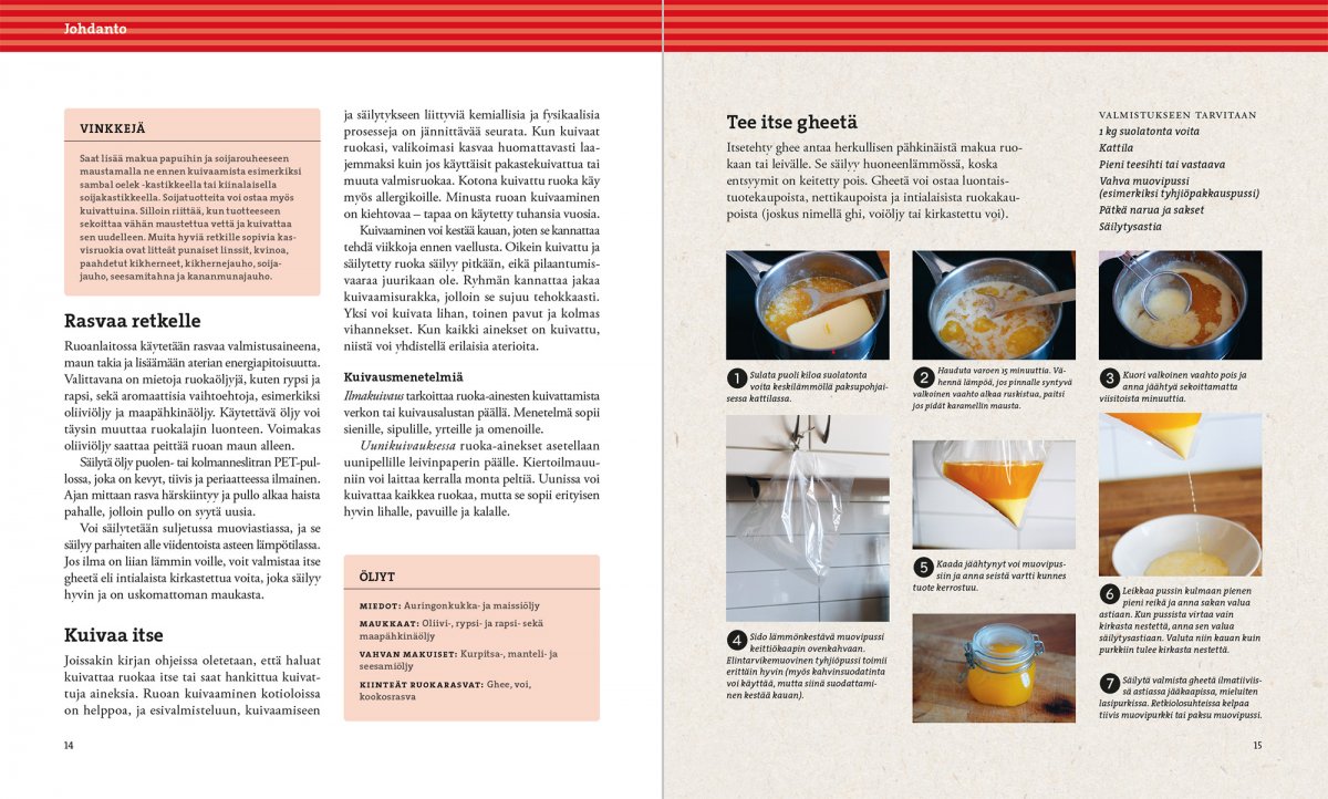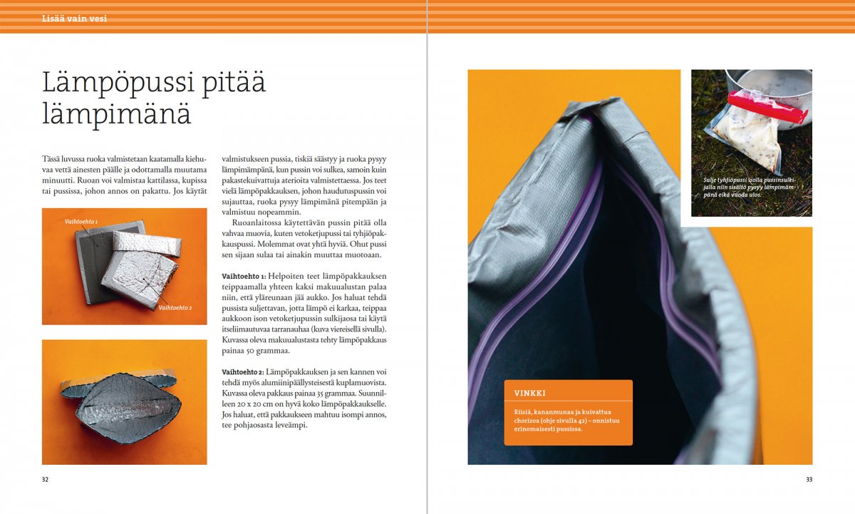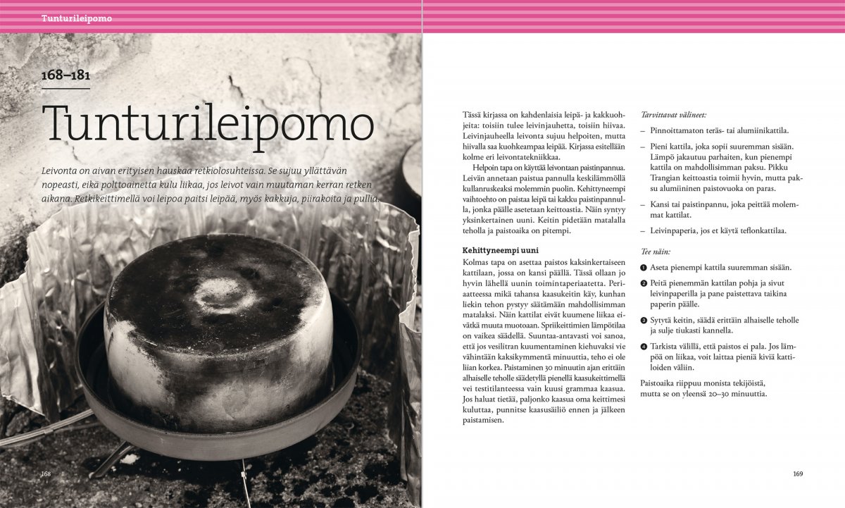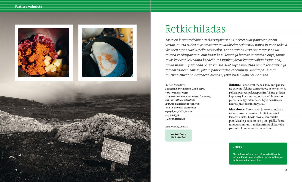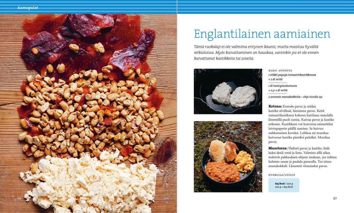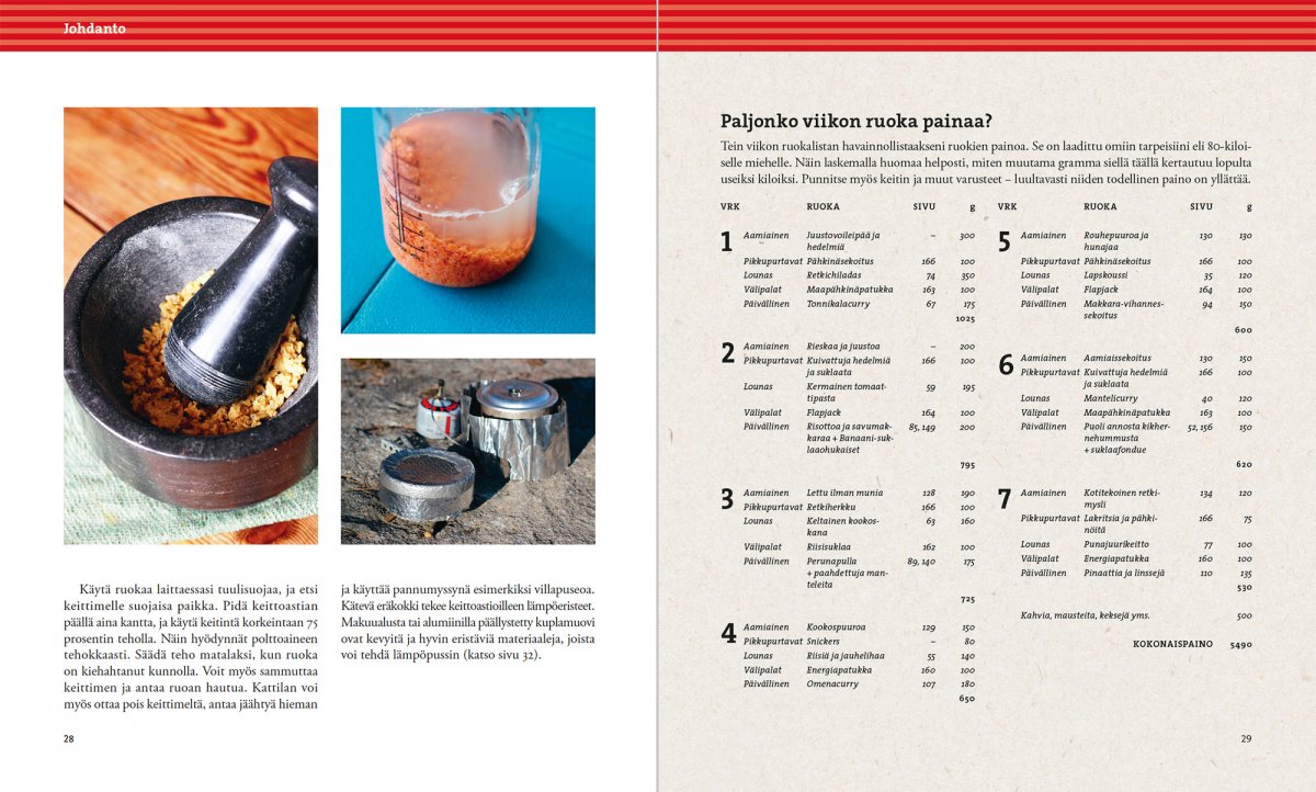Reseptit on jaoteltu niiden valmistamiseen kuluvan ajan mukaan: joihinkin tarvitsee lisätä vain kiehuvaa vettä, jotkut valmistuvat viidessä tai viidessätoista minuutissa, loput vaativat puolen tunnin valmistusajan. Lisäksi kirja neuvoo välipaloista ja jälkiruoista sekä leivonnasta vaellusoloissa.