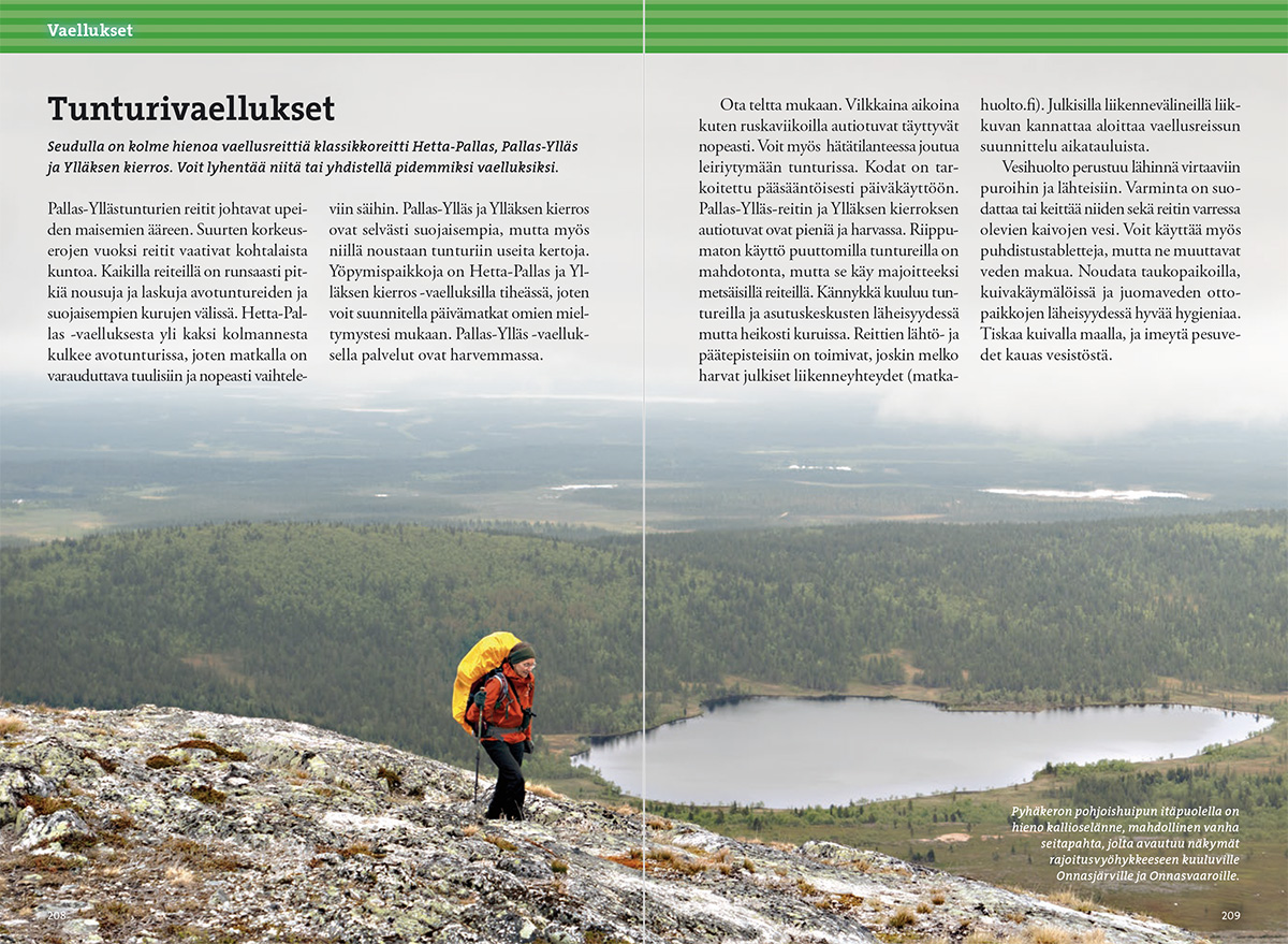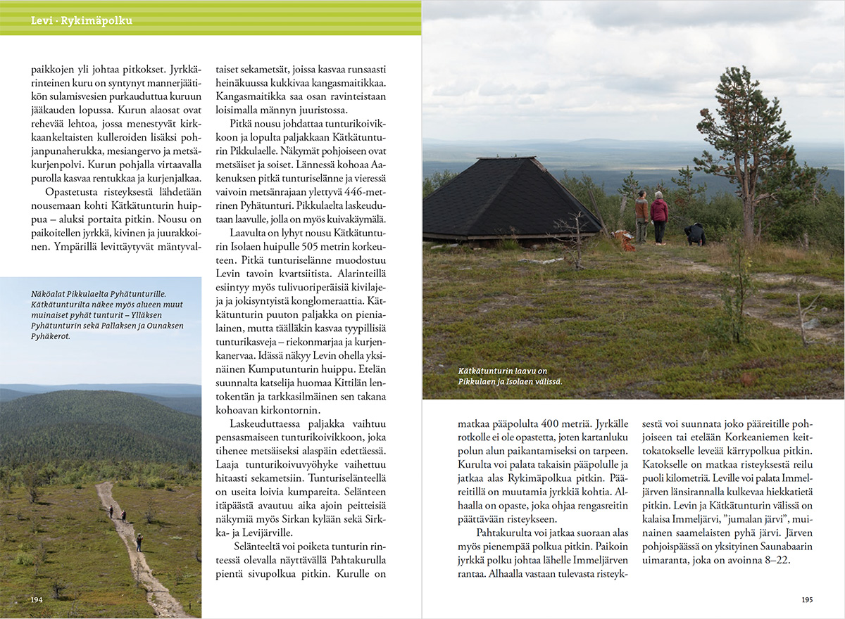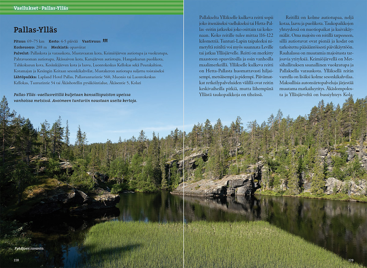 Denna guidebok (skriven på finska) presenterar hela 46 dagsturer och 3 längre vandringsleder. Den täcker nationalparken med omgivande sommarleder samt markerade leder kring Hetta och Levi. Boken är uppdelad i fyra geografiska områden och innehåller dessutom inspirerande natur- och kulturhistoria samt praktiska tips för en lyckad tur.