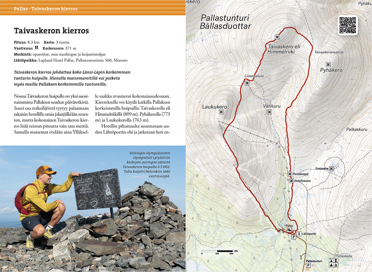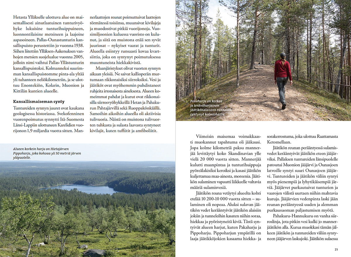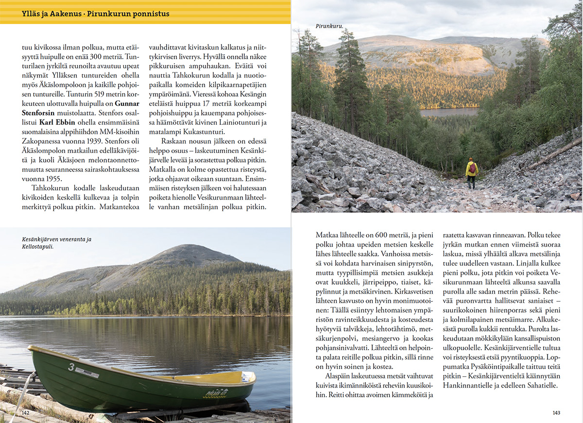 Denna guidebok (skriven på finska) presenterar hela 46 dagsturer och 3 längre vandringsleder. Den täcker nationalparken med omgivande sommarleder samt markerade leder kring Hetta och Levi. Boken är uppdelad i fyra geografiska områden och innehåller dessutom inspirerande natur- och kulturhistoria samt praktiska tips för en lyckad tur.