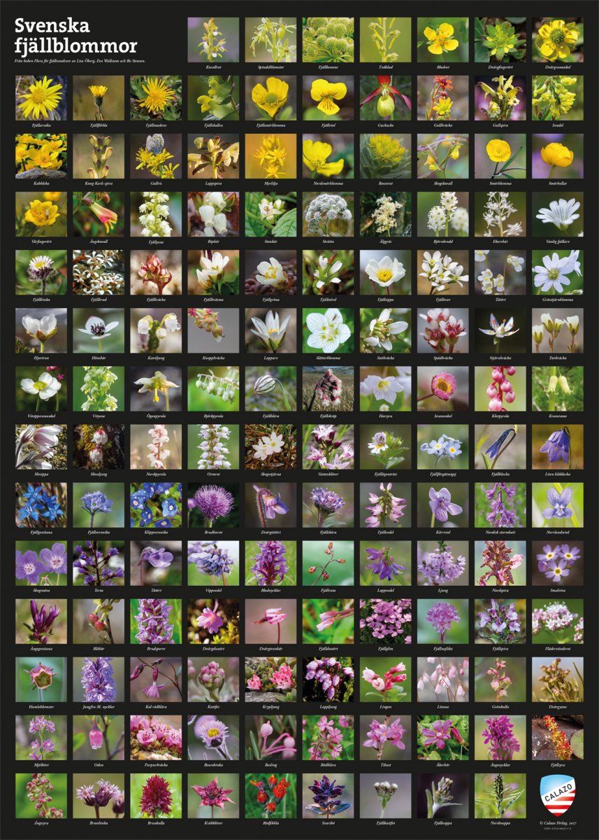 Det här är en poster som visar några av de många blommor som växer i den svenska fjällkedjan. Bilderna kommer från boken Flora för fjällvandrare. Formatet är 50 x 70 cm.