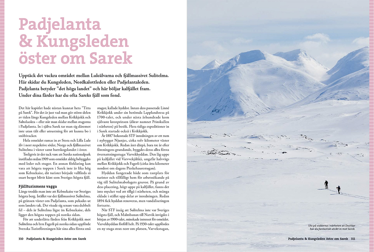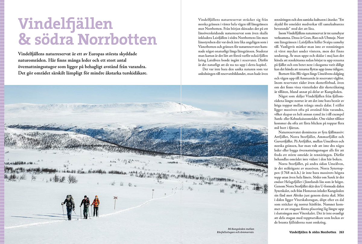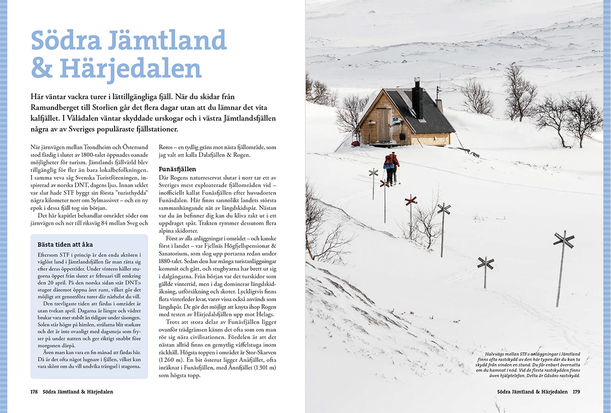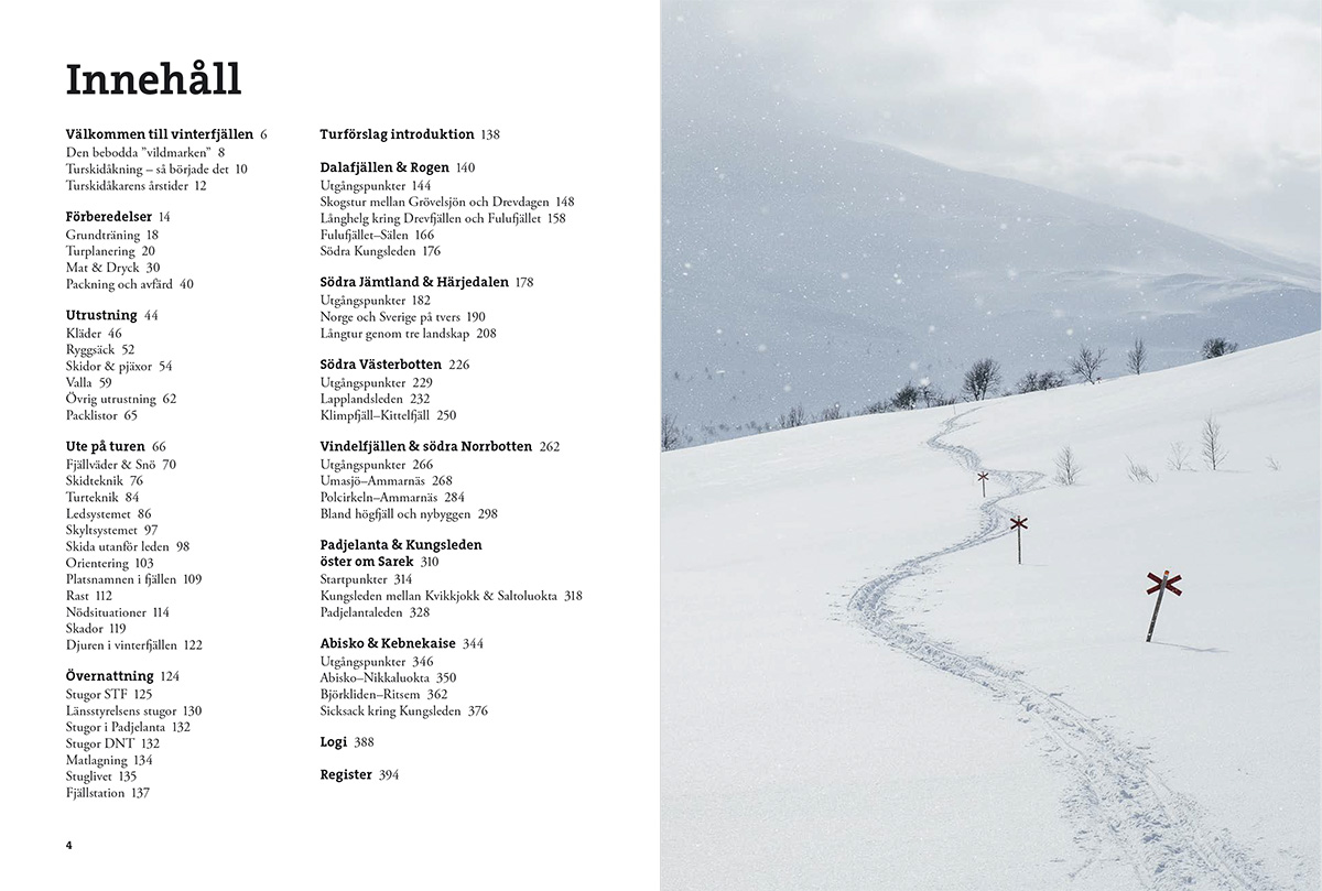 Boken består av två delar: först en omfattande handledning med all kunskap du behöver för att planera och genomföra en vintertur mellan fjällstugor, därefter en guide till våra finaste fjällområden med femton färdiga turförslag som passar både nybörjare och erfarna skidåkare.
