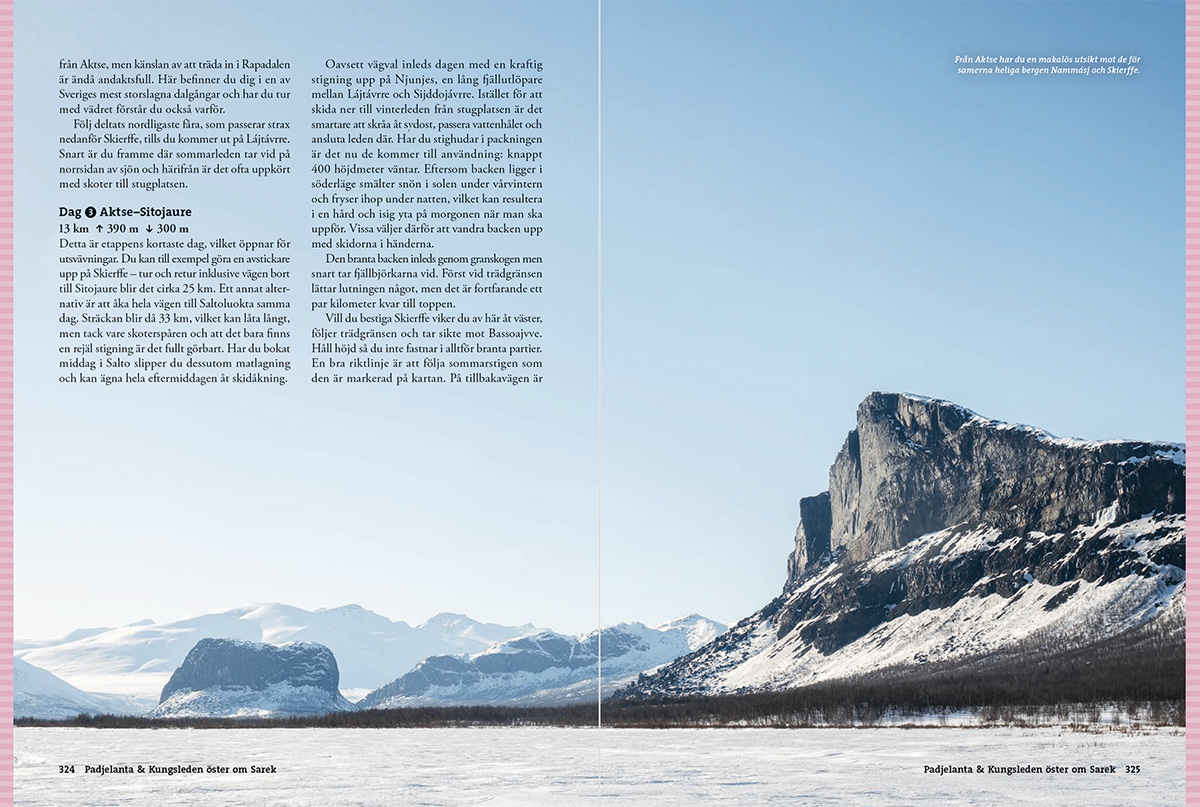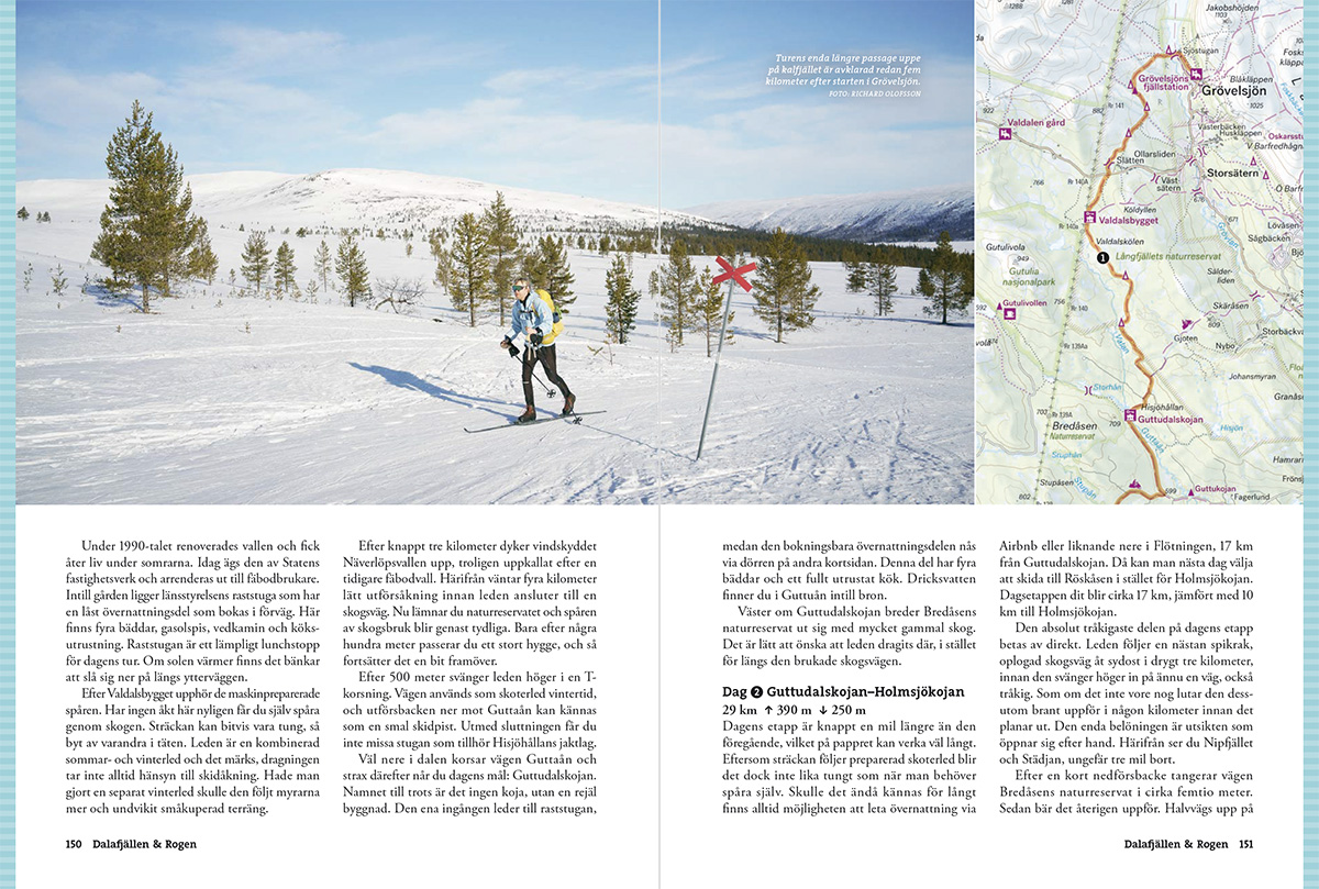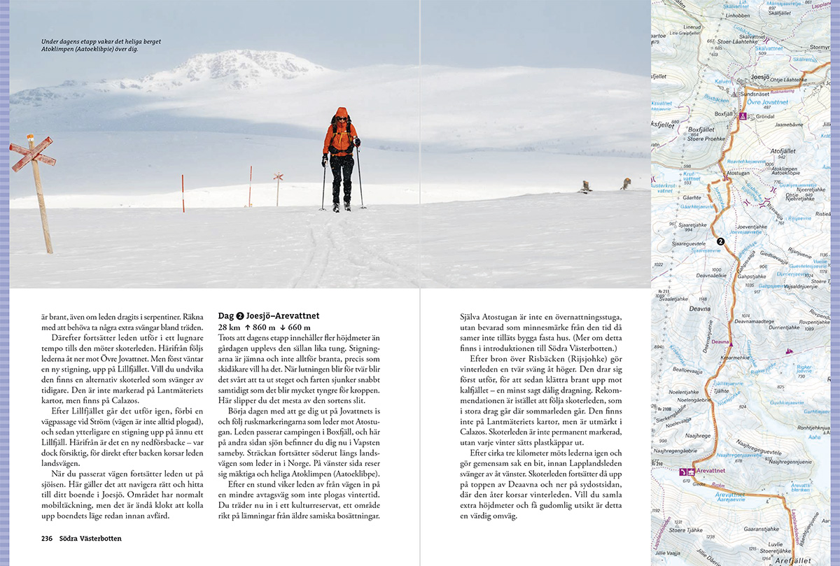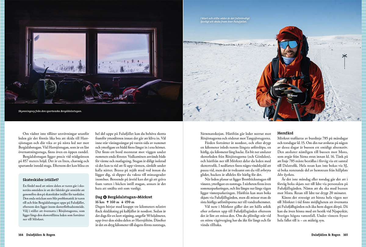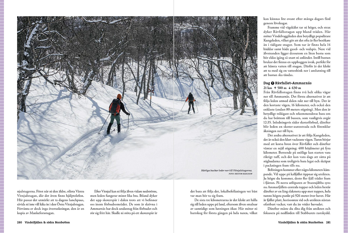 Boken består av två delar: först en omfattande handledning med all kunskap du behöver för att planera och genomföra en vintertur mellan fjällstugor, därefter en guide till våra finaste fjällområden med femton färdiga turförslag som passar både nybörjare och erfarna skidåkare.
