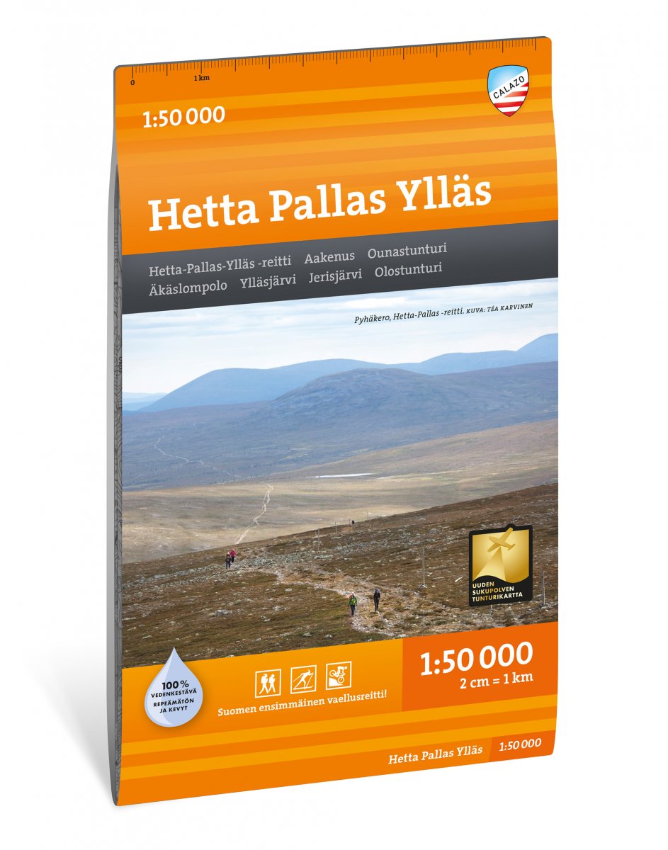 Hetta-Pallas -reitille! Suosituin vaellusreittimme kulkee vanhimmassa kansallispuistossamme ja jatkuu Ylläkselle ja Aakenukselle asti. Seudulla riittää retkeiltävää tunturireittien lisäksi myös Jerisjärvellä ja Ounasjoella. Karttamme painetaan mainiolle Tyvek-materiaalille, joka on vedenkestävää ja repeämätöntä. Niinpä sinun ei tarvitse suojata karttaasi sateelta eikä karttasi repeydy käytössä. Valmistaja takaa materiaalin kestävän 20 000 taittokertaa. Nerokkaan lehtijaon ansiosta kaikki alueen tärkeimmät retkikohteet mahtuvat yhdelle kartalle.