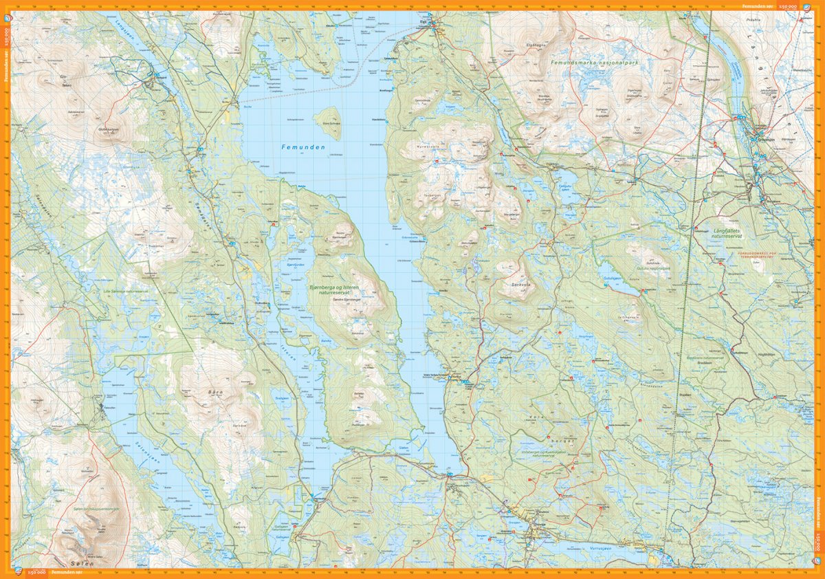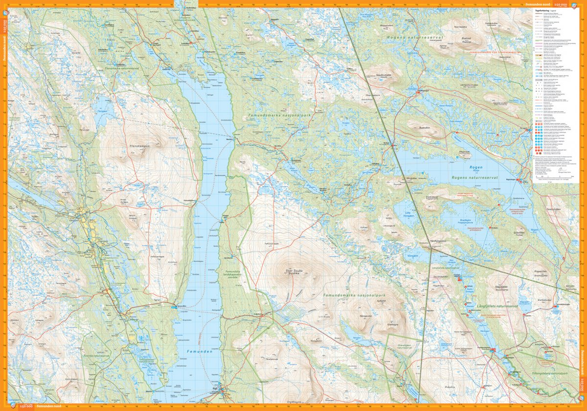 Med kartvisninger på både for- og baksiden, dekker dette kartet store deler av Femundsmarka nasjonalpark og de populære vandringsområdene på begge sider av nasjonsgrensen mellom Norge og Sverige. Fra Langen og Rogenstugan i nord, Svukuriset og Grövelsjön, til Femundtunet i sør.