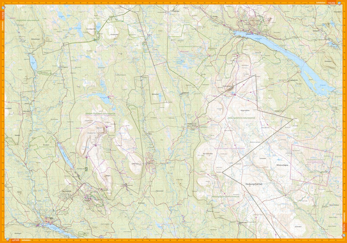 Stort utsnitt från Lofsdalen i nordost till Drevfjällens naturreservat i sydväst, två kartor i ett om man jämför med Lantmäteriets utsnitt. Men även mer detaljer som tydligt markerade preparerade skidspår, stugservice mm.