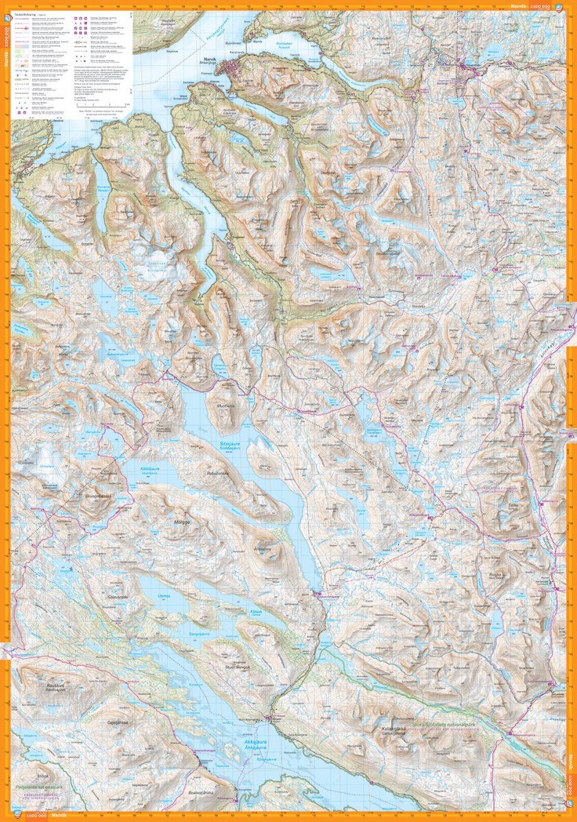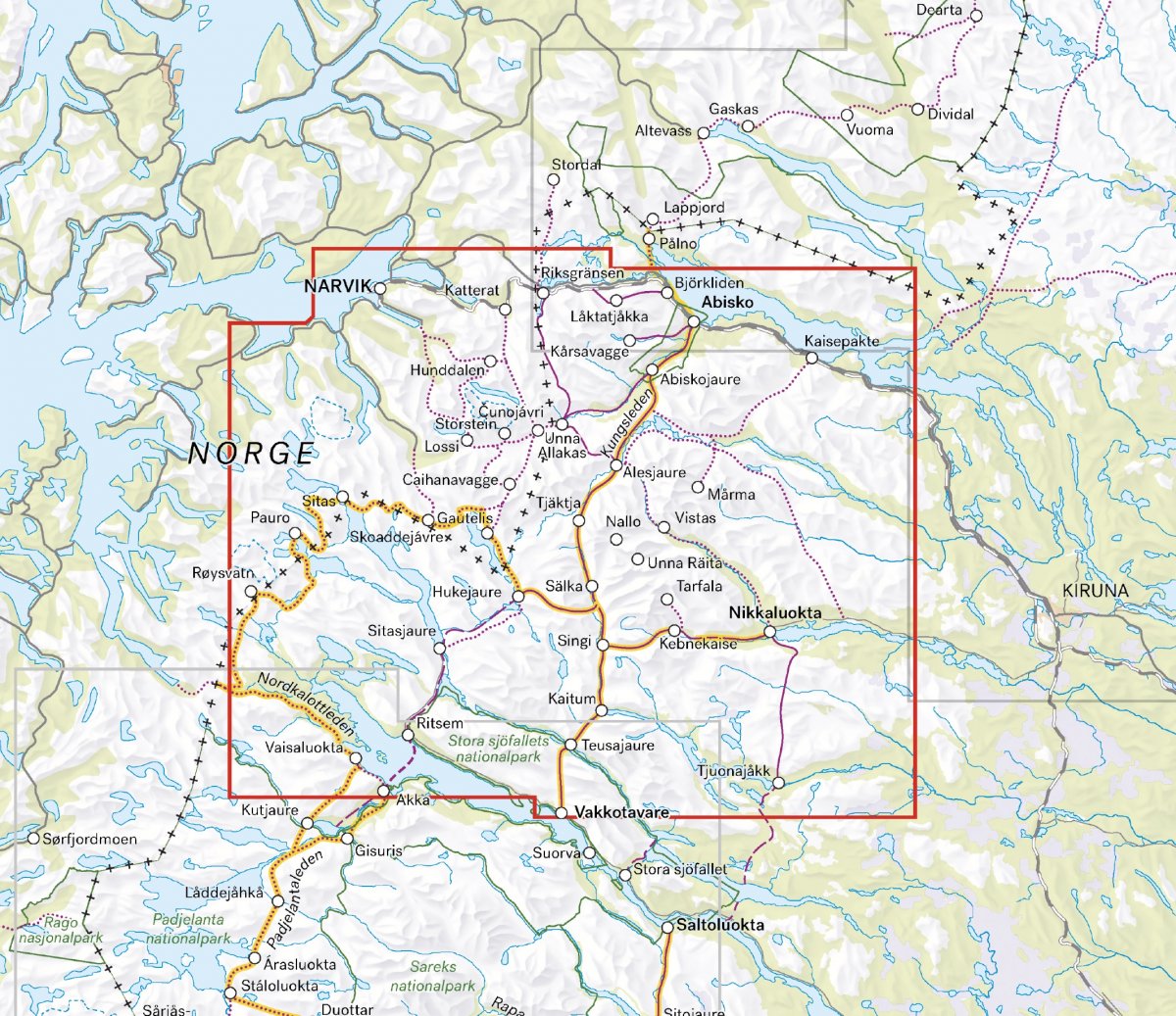 Den här kartan täcker hela Kebnekaisefjällen från Abisko, Riksgränsen och Narvik i norr till Ritsem och Vakkotavare i söder. Kungsledens hela sträckning mellan Abisko och Vakkotavare är med i kartan samt Nordkalottleden mellan Björkliden och Vaisaluokta.