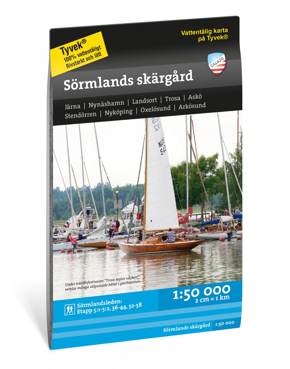 Den här kartan över Sörmlands skärgård täcker området från Järnafjärden i norr till Bråviken och Arkösund i söder. Det är lika mycket en traditionell Terrängkarta för vandrare som Sjö- och kustkarta för paddlare. Vi har gjort samma grundliga arbete med lokala kortare vandringsleder och kartan täcker även delar av Sörmlandsleden. Vi har kompletterat innehållet med betydelsefull information för paddlare. Det kan vara grund och farleder, rutter förskärgårdstrafik och annan intressant service som livsmedelshandel och bastu i skärgården. Vi har kommit fram till att det bästa materialet för en karta är Tyvek®. Det är gjort av en syntetfiber som gör kartan helt okänslig för vatten och mycket rivtålig. En Tyvekkarta går inte sönder i vecken eller tappar färgen när du använder den.