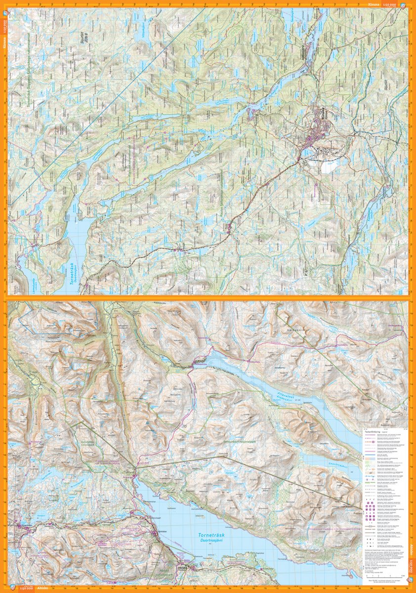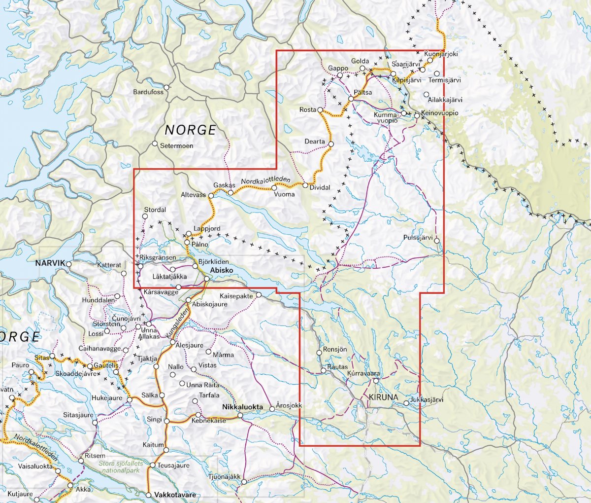 Den här kartan täcker fjällområdet norr om Kiruna och Abisko upp till Treriksröset. Kartan rymmer stora områden på bägge sidorna av riksgränsen mellan Sverige och Norge och är perfekt för dig som vill vandra Nordkalottleden mellan Abisko och Kilpisjärvi eller besöka Vadvetjåkka nationalpark. Vandrar du Gröna bandet och har följt hela fjällkedjan norrut ända från Sälen blir detta den allra sista kartan du tar upp ur packningen.