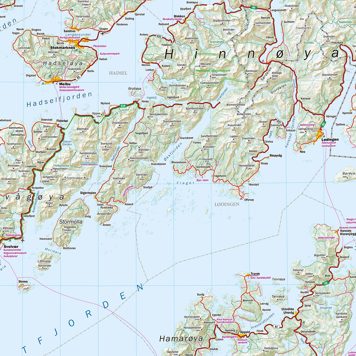 En ny och uppdaterad karta över Lofoten, Vesterålen, Narvik och Ofoten – perfekt för bilresor och upptäcktsfärder. Tydligt markerade turistvägar och sevärdheter gör det enkelt att hitta de bästa platserna i området.