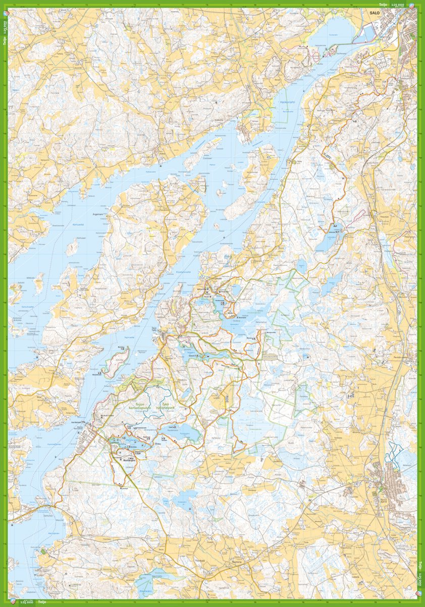 Teijon maisemaa hallitsevat meren saaret, järvet ja kalliometsät. Alavilla paikoilla on rämeitä, rinnekuusikoita ja vetisiä korpipainanteita sekä Etelä-Suomessa harvinainen lettosuo. Täällä pesivät kanadanhanhi, kurki, liro ja teeri; nisäkkäistä voi kohdata metsäkauriin ja ilveksen. Luontopolkuja ja merkittyjä reittejä on 50 kilometriä. Retkeilijää palvelevat lisäksi laavut, nuotiopaikat, telttaalueet ja vuokrakämppä. Matildanjärveen istutetaan saaliskaloja virkistyskalastajien iloksi. Halikonlahden rautaruukit kertovat 1600-luvulla käynnistyneestä elinkeinosta. Kemiönsaari tunnetaan hyvin merkityistä reiteistä ja unohtumattomista saaristoelämyksistä. Karttamme painetaan mainiolle Tyvek®-materiaalille, joka on vedenkestävää ja repeämätöntä. Niinpä sinun ei tarvitse suojata karttaasi sateelta eikä karttasi repeydy käytössä. Valmistaja takaa materiaalin kestävän 20 000 taittokertaa. Nerokkaan lehtijaon ansiosta kaikki alueen tärkeimmät retkikohteet mahtuvat yhdelle kartalle.